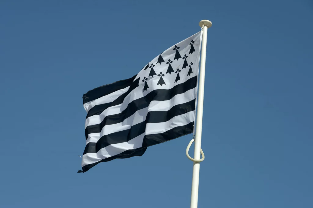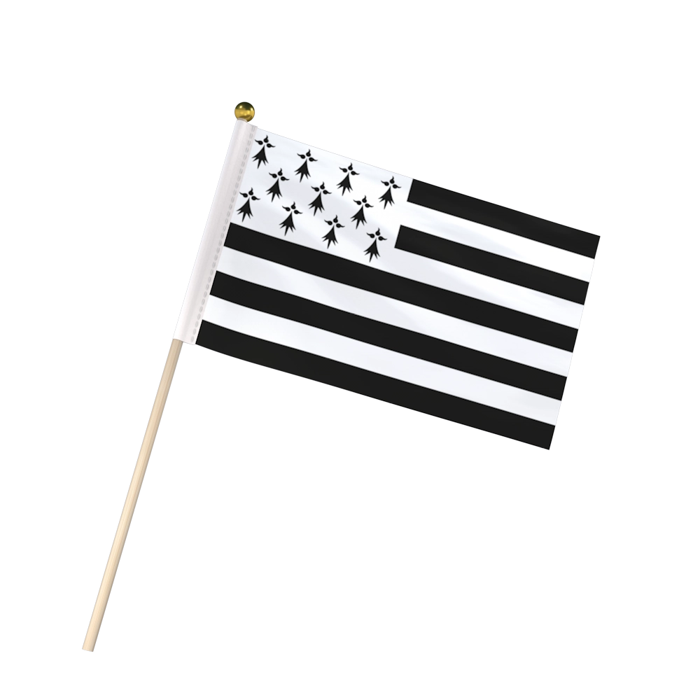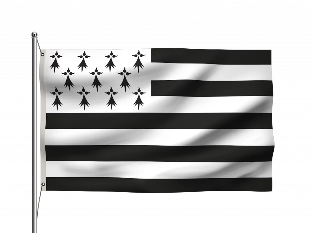 Le drapeau de la Bretagne est constitué de neuf bandes horizontales commençant et terminant par du noir, alterné avec des bandes blanches. Sur la partie supérieure gauche, on retrouve un rectangle blanc avec à l’intérieur, onze mouchetures d’hermine.